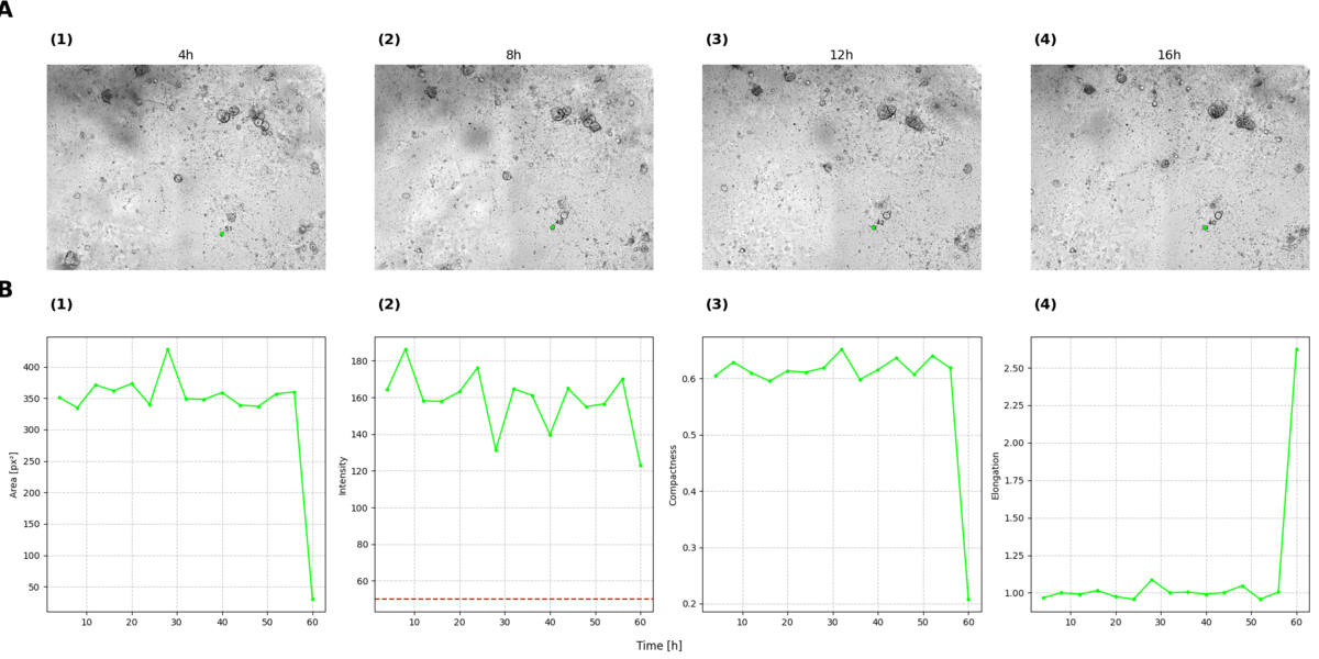 Fig 6: One organoid tracked over time. (A) Images showing the organoid at the different time points: (1) 4h, (2) 8h, (3) 12, (4) 16. (B) Parameters plotted over time for the organoid. Panels (A) Area, (B) Intensities, (C) Compactness, and (D) Elongation are plotted over time for the organoid. In the intensity plot, the red line represents a threshold set at 50, based on the findings of Kulkarni et al. [5], to determine the health status of the organoid. An organoid with an intensity value above this threshold is considered healthy, while a value below it indicates an unhealthy organoid. When examining the progression of these parameters over time, it is evident that they remain relatively steady until the 60-hour mark, where significant changes occur, indicating a major event affecting the organoid's condition.