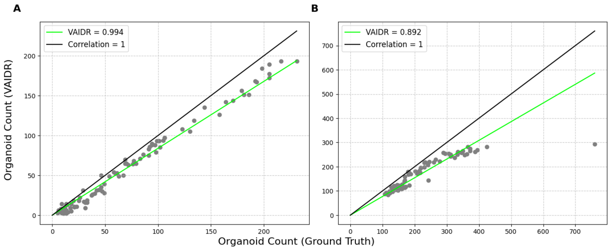 Fig 4: Correlation of organoid counts between the ground truth and VAIDR. Correlation analysis was conducted for (A) human images and (B) mouse images. The predictions by VAIDR demonstrate high accuracy overall. However, segmenting human images appears to be easier compared to mouse images, suggesting that VAIDR performs better with human data, likely due to the less complex nature of the images.