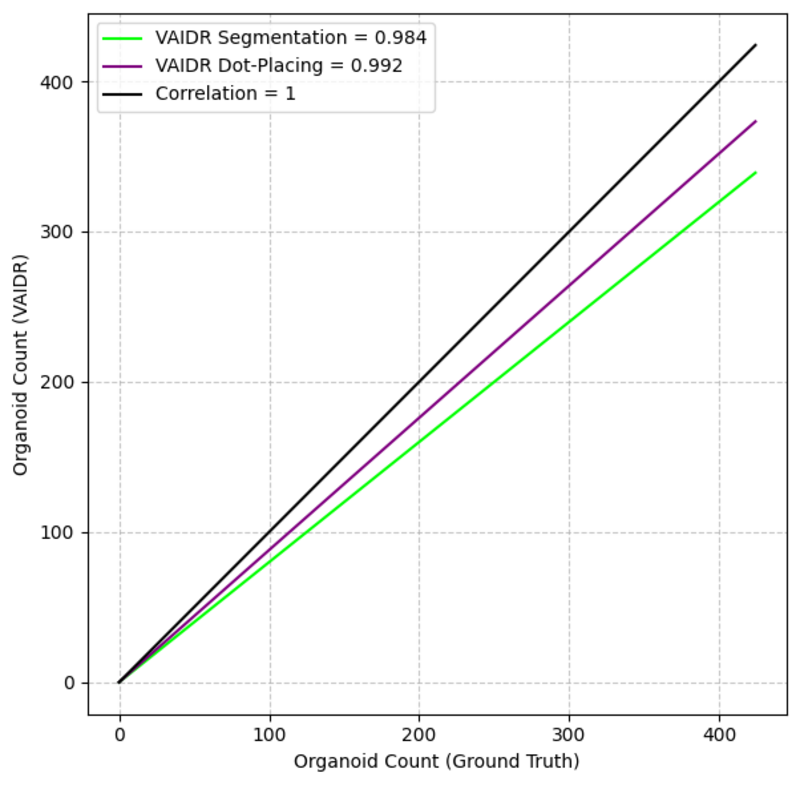 Upon reviewing the images with the most pronounced discrepancies in organoid counts, specifically the early-stage mouse images, it becomes apparent that the high number of organoids - where organoids touch and overlap - presents a challenge. Another significant challenge is the presence of immune cells in the background, which complicates the segmentation process. These cells can interfere with accurate boundary detection and contribute to increased complexity in distinguishing between organoids and surrounding structures. This likely explains why VAIDR was unable to identify all individual organoids, as distinguishing between them becomes increasingly difficult in densely packed regions.